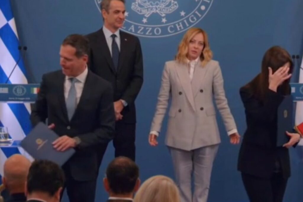 Il video della Meloni che sbuffa mentre la speaker parla durante l'incontro con il premier greco (foto da video) - Blitz quotidiano