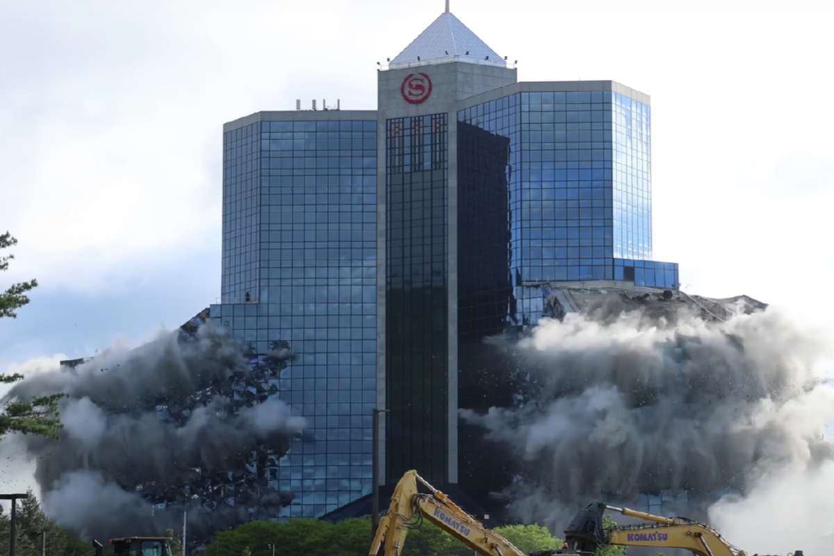 Alle 7:30 di sabato mattina, lo Sheraton Crossroads Hotel è stato fatto crollare con una spettacolare implosione controllata. In poco più di 15 secondi, l’hotel e tutti i suoi 22 piani sono stati rasi al suolo. La demolizione, ripresa in video, ha attirato la curiosità di centinaia di persone, che si sono radunate assistendo al boato, al crollo e poi alla nuvola di polvere che si è alzata dalle ceneri dell’hotel.