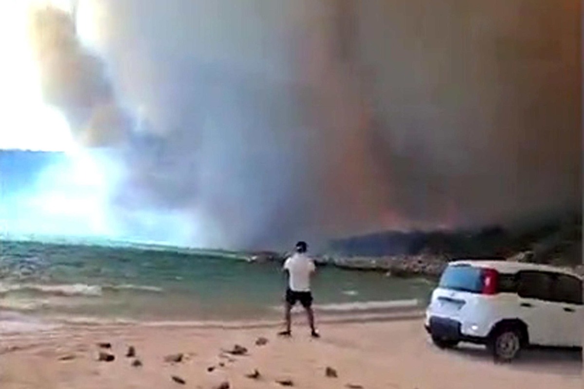 Il fuoco ha raggiunto anche il parcheggio, devastando la maggior parte delle auto lasciate dai turisti. Mentre alcuni tentavano di salvare i propri veicoli, molti altri si sono limitati a fuggire, lasciando tutto dietro di sé. La spiaggia, in pochi minuti, si è trasformata in uno scenario apocalittico.
