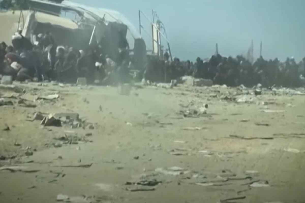 Folle di palestinesi accovacciati in attesa prima di correre verso i veicoli delle Nazioni Unite al loro arrivo con aiuti da distribuire alla popolazione a Gaza, e intanto colpi di arma da fuoco, di avvertimento sembrerebbe, che si sentono distintamente e colpiscono il suolo, alzano la polvere. Non bastano a fermare la disperazione delle decine di persone che si avventano letteralmente sui mezzi dell’Onu nella speranza di assicurarsi così cibo e viveri.