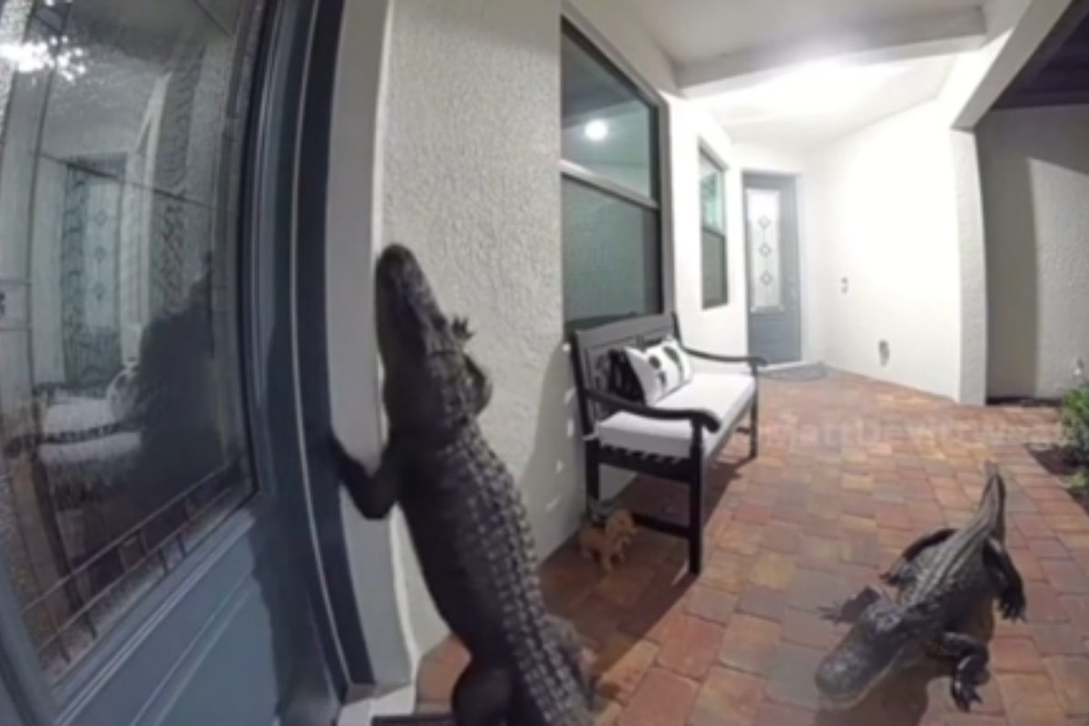 Altro che Amazon o il vicino impiccione: in Florida, quando ti bussano alla porta, potrebbe essere un alligatore. O due. Nella tranquilla comunità di Ave Maria, le telecamere di sorveglianza di un’abitazione hanno immortalato una scena degna di un film: due enormi alligatori si presentano alla porta, uno dei quali – con una goffaggine quasi tenera – prova addirittura a “bussare”. L’altro osserva la scena ma senza la minima intenzione di partecipare.