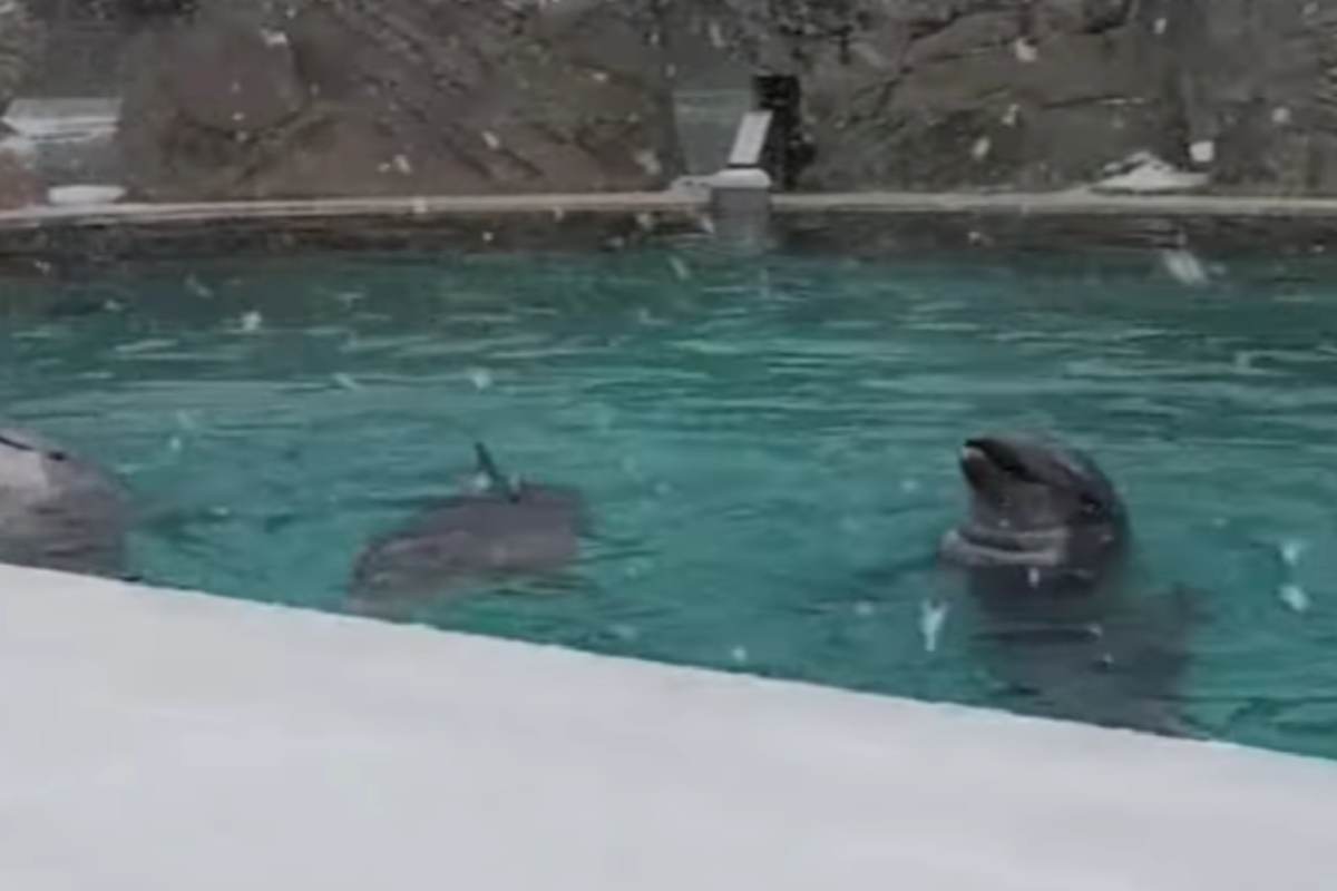 Sul web è diventato subito virale il video in cui si vedono alcuni delfini che osservano con curiosità i fiocchi di neve presso il parco Oltremare di Riccione. In questi giorni, infatti, le strutture esterne del parco, le vasche e gli spazi aperti sono stati imbiancati, creando uno scenario suggestivo e piuttosto insolito. Le immagini mostrano i tursiopi che seguono i movimenti della neve con lo sguardo, un comportamento figlio della natura di questi cetacei, della loro spiccata curiosità e della tendenza a interagire con tutto ciò che li circonda.
