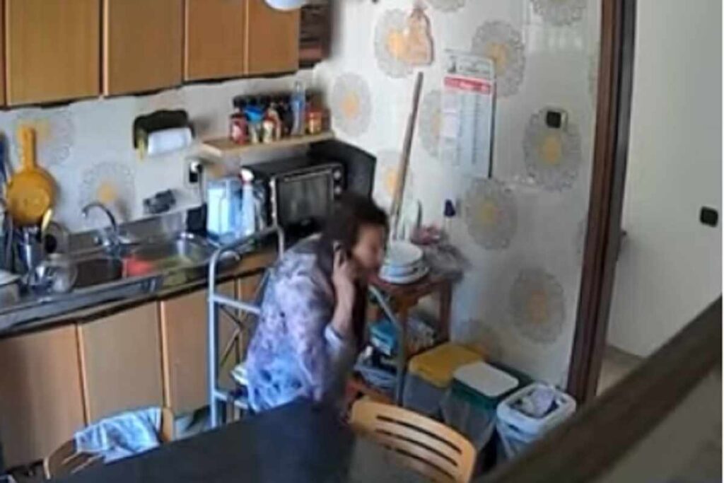 Mentre tutti gli oggetti si muovono, un’anziana è al telefono e continua a parlare. Davanti a lei si vedono cadere a terra degli oggetti tra cui una bottiglia. A scossa finita si sente suonare in lontananza un allarme.
