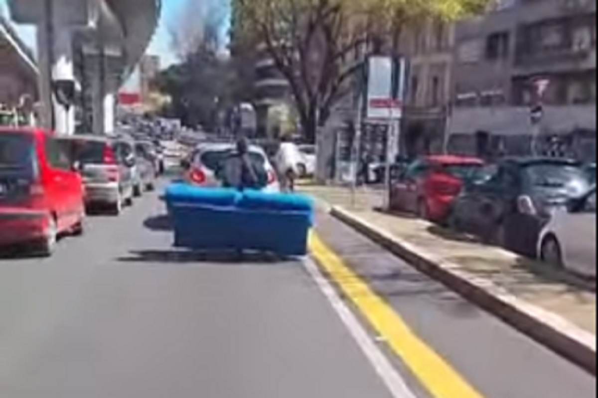 A Roma un uomo trasporta sul monopattino un divano da due posti. Siamo su via Prenestina, una delle arterie tra le più trafficate della città. Una scena simile non si era mai vista. Ad esserne consapevole è anche l’autore del video, probabilmente un uomo in scooter, che infatti commenta: “Guarda questo su via Prenestina oh…. te devo ripiglià guarda…. cioè questo co un monopattino sta a portà un divano su via Prenestina”.