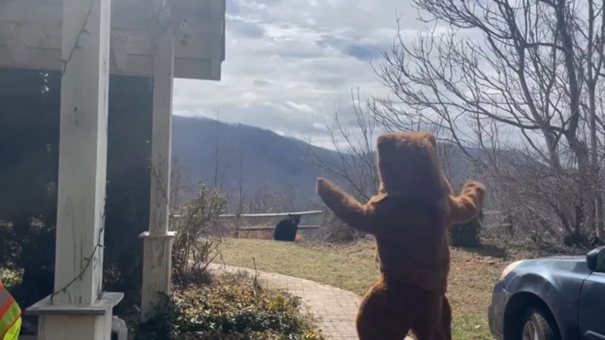 Come cacciarlo via? Coraggioso e creativo, l’uomo si è travestito da orso. Un appariscente e pelosa tuta tipo Carnevale e una testa da orso sopra, una testa simile ai peluche che deliziano i bambini.