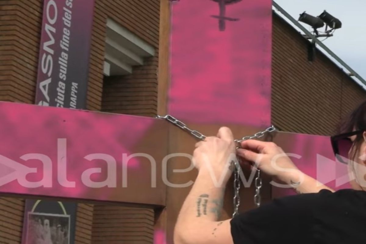 L’artista e attivista Cristina Donati Meyer ha installato una nuova opera in Largo Greppi, davanti al Piccolo Teatro Strehler di Milano. Titolo della creazione, ‘ECCE VULVA – CONSENSO CROCIFISSO’. L’opera consiste in una vulva realizzata con tessuti vari, colla vinilica, colori acrilici e glitter, appesa a un crocifisso in legno con base in ferro.